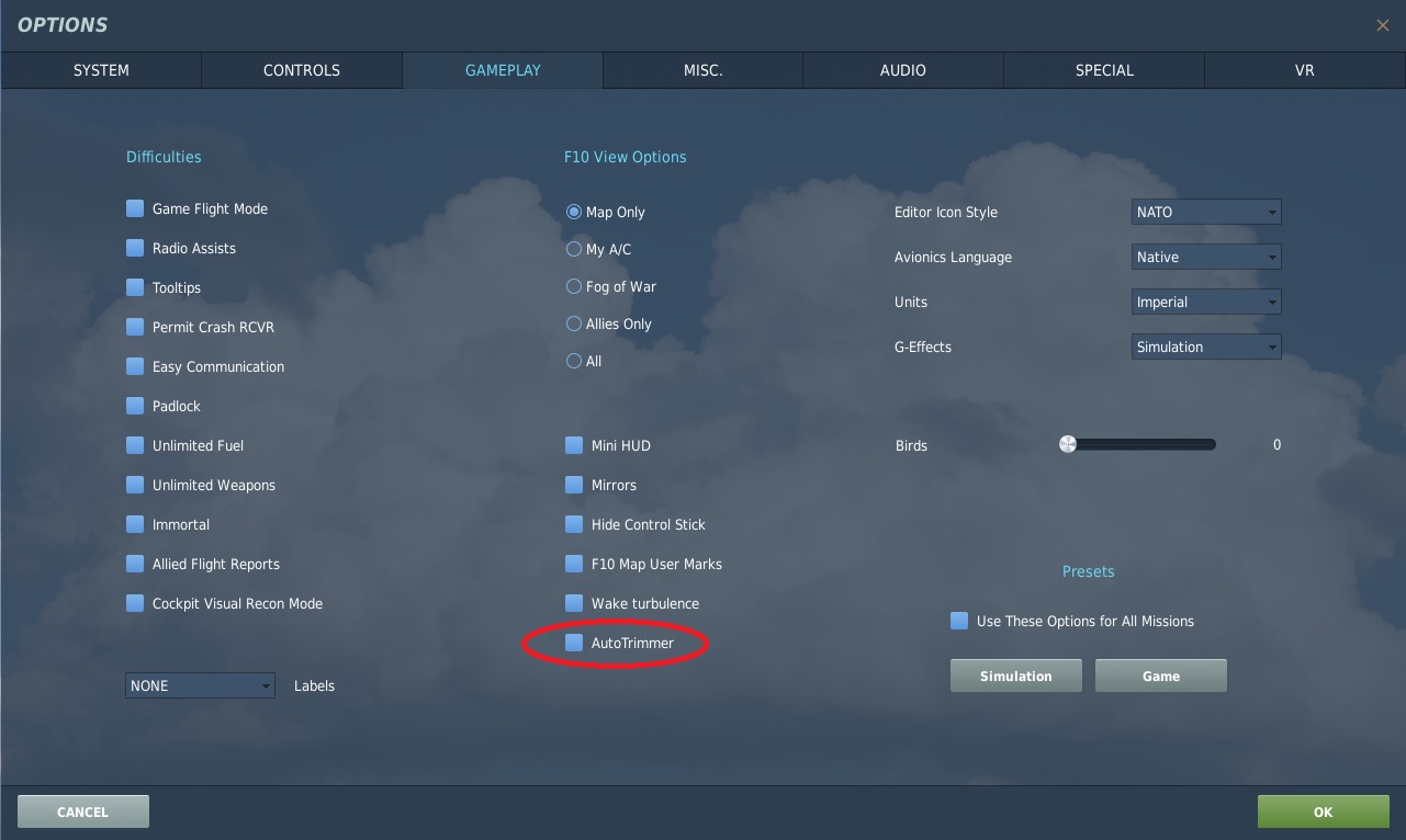 Unter Gameplay darf der AutoTrimmer nicht aktiviert sein. Sobald dieser aktiv ist, habe ich die selbe Situation wie bei dir.