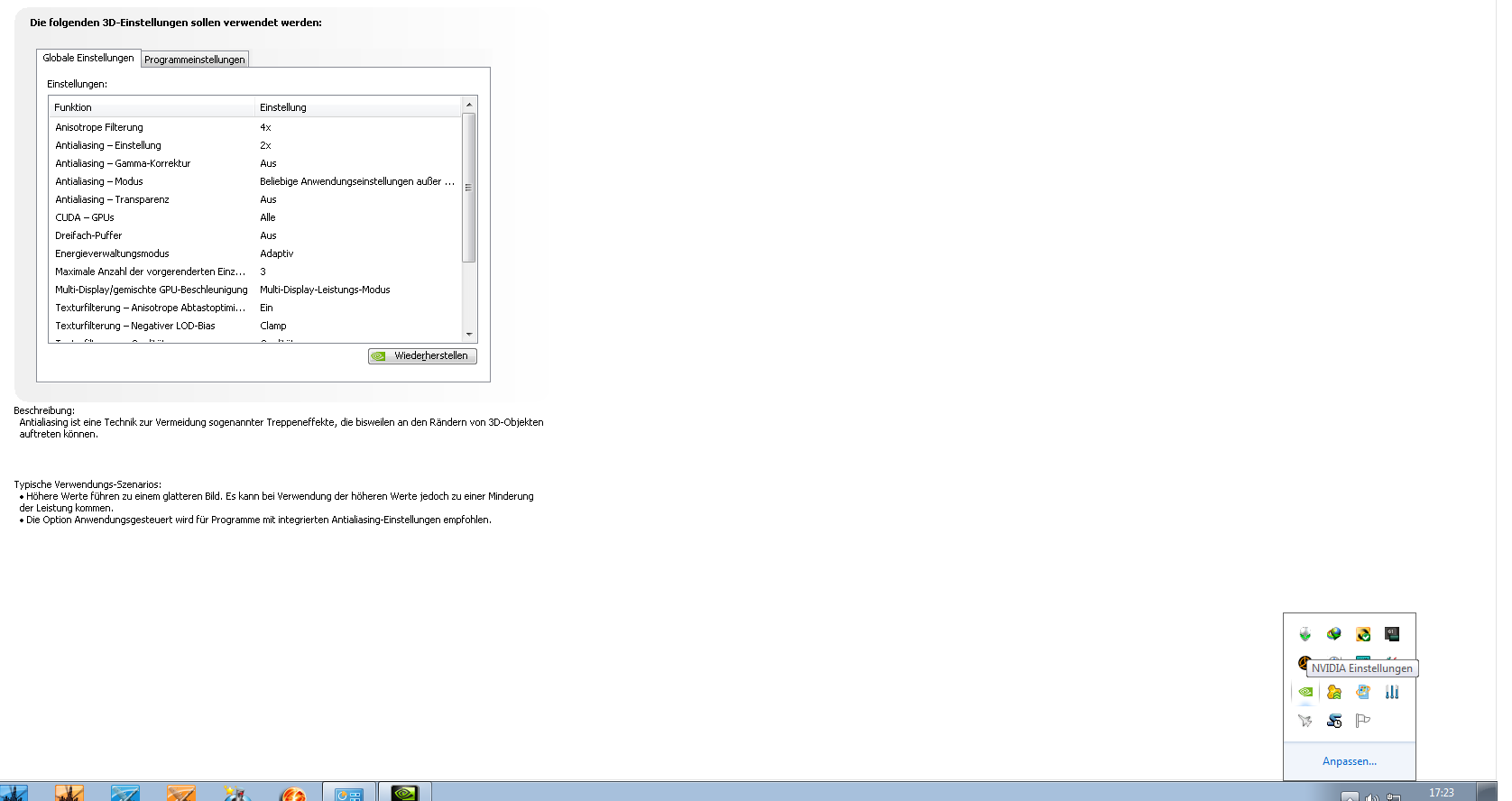 Da dein NVIDIA Config zeigt, dass das auf "Anwendungsgesteuert" gestellt ist, versuche bitte einmal in dem NVIDA-Tool die Werte global vorzudefinieren. Also statt "Anwendungsgesteuert" bei AntiAliasing müsste es sowas wie "8x" geben.