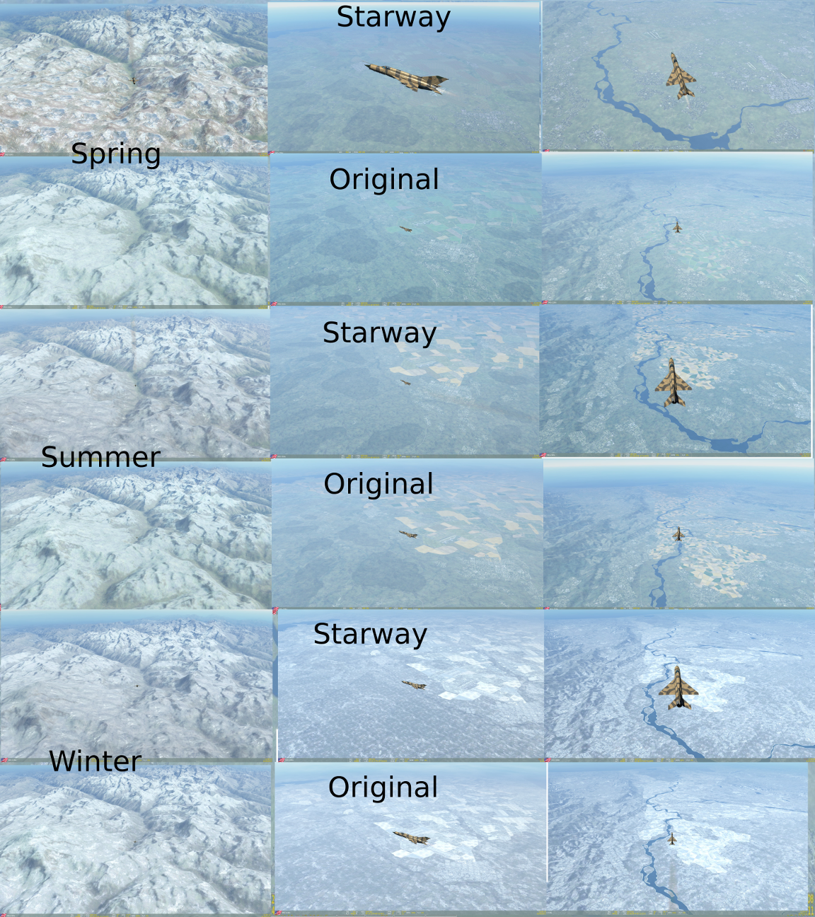 Ich habe im Netdrive mal von mir erstellten Vergleich der Jahreszeiten zwischen Starway und Original aus 45k ft unter /MODS gepeichert. Ist 45MB groß in guter Auflösung, hier mal das kleine Bild: Im Großen und ganzen finde ich das Original in der Höhe besser. Aus Heli-Perspektive ist Starway natürlich besser.