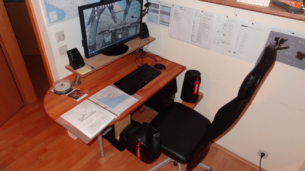 Also was die Platzierung des HOTAS betrifft habe ich mir Halterungen gebaut, die das ganze System rechts und links neben mich bringen, und etwas tiefer als die Schreibtischplatte. Als beide noch auf dem Tisch standen, schmerzten bei längeren Flügen meine Schultern. Jetz sind sie in etwa da, wo sie im echten Flieger auch wären.