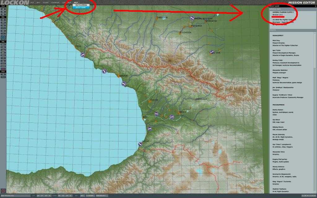Im Mission-Editor auf "HELP" und dann "ABOUT GAME" klicken. Siehe Screenshot!