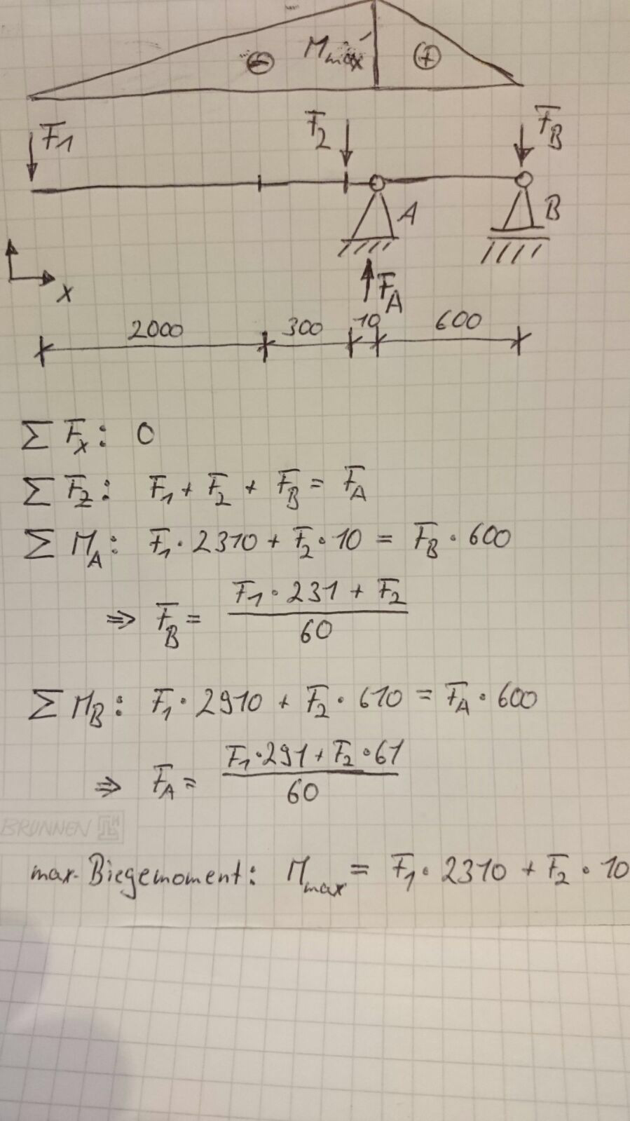 Nachdem die Kräfte auf den Rahmen und Achse berechnet worden sind (siehe unten das Scibble) werden gerade Belastungtest mit Flaschenzug am U-Rahmen gemacht,