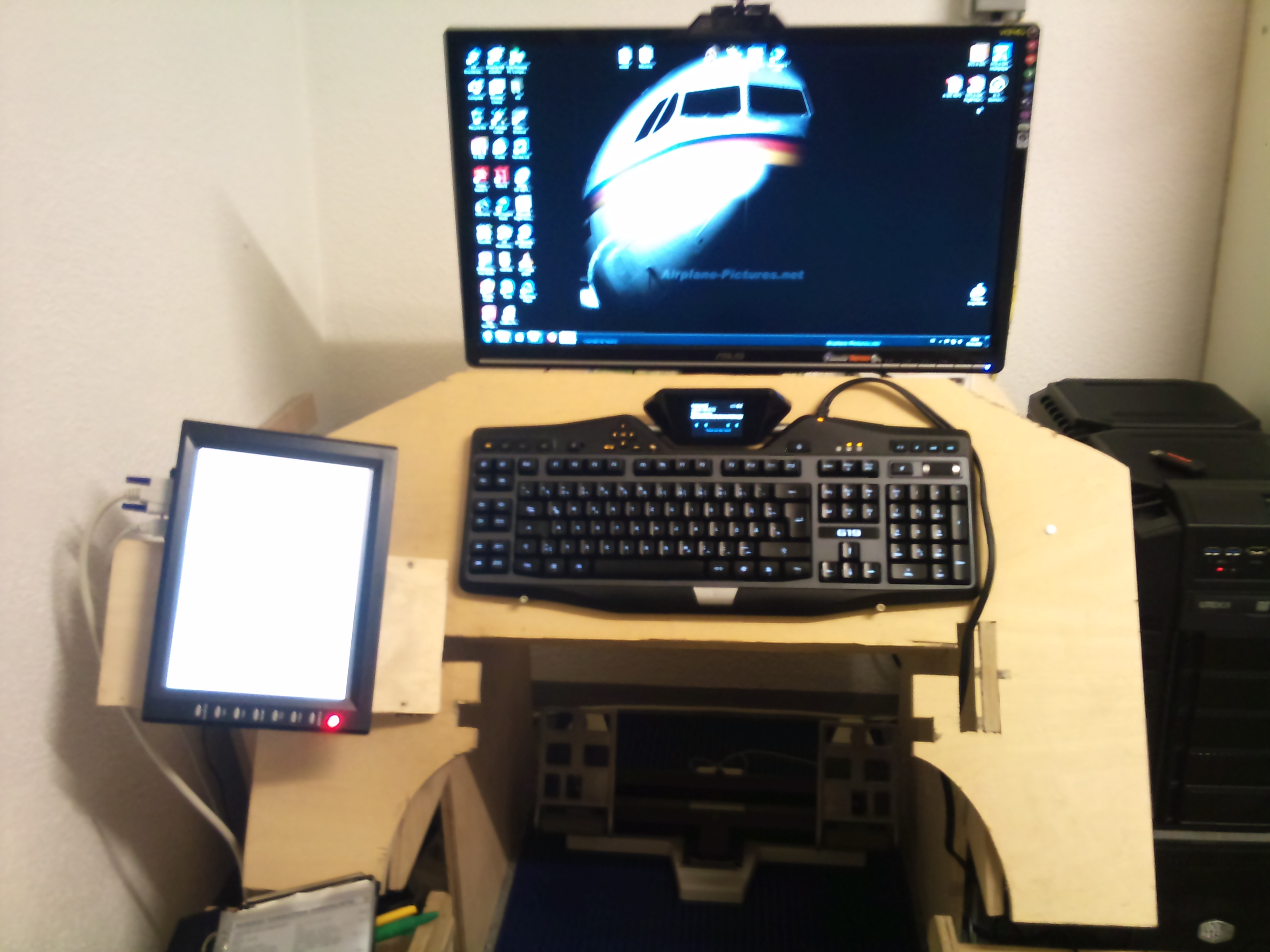 Also was die Platzierung des HOTAS betrifft habe ich mir Halterungen gebaut, die das ganze System rechts und links neben mich bringen, und etwas tiefer als die Schreibtischplatte. Als beide noch auf dem Tisch standen, schmerzten bei längeren Flügen meine Schultern. Jetz sind sie in etwa da, wo sie im echten Flieger auch wären.