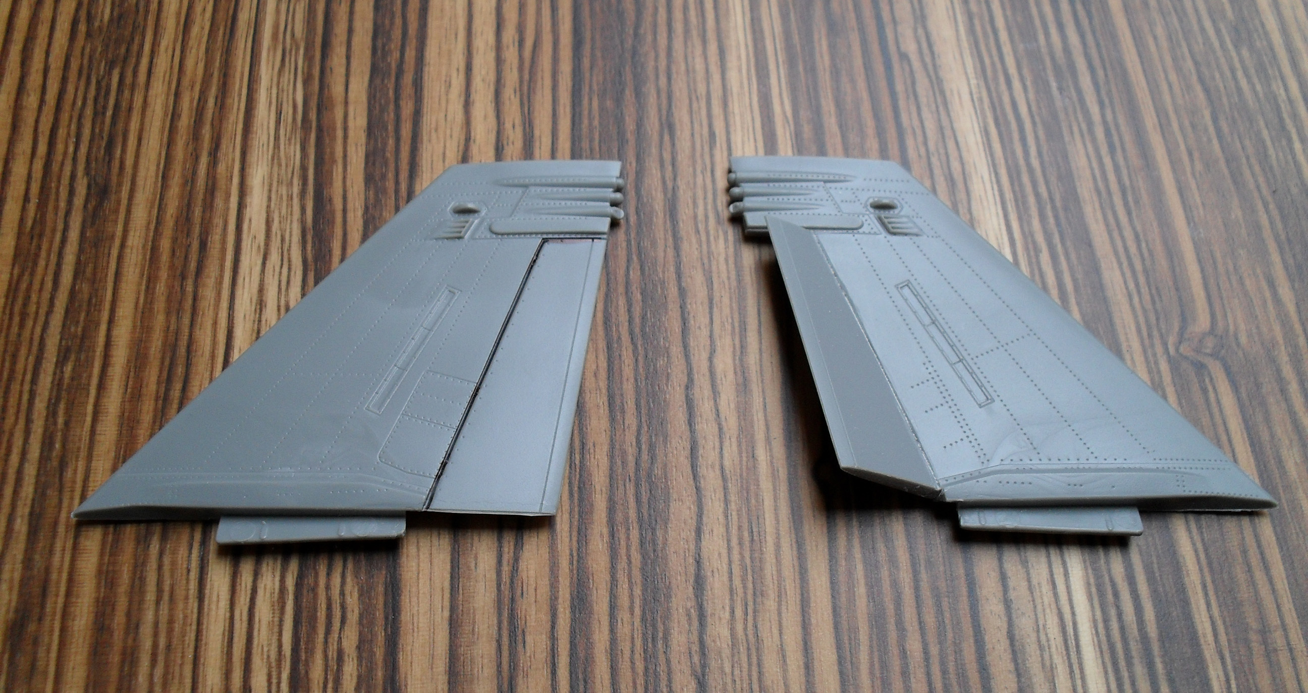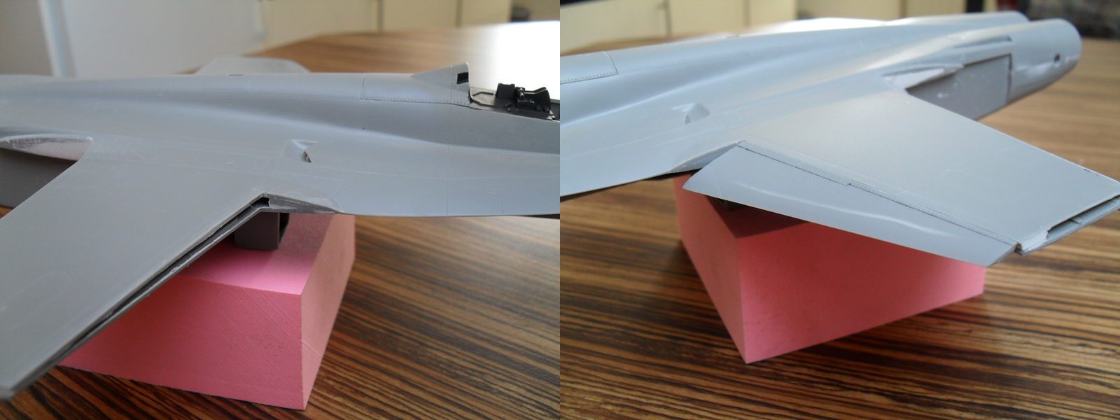 Hab den kompletten Bausatz verstümmelt, um die Flügel in hochgeklapptem Zustand zu bekommen, plus gesenkter Flaps, Ailerons und Leading Edges. Eine riesen Aktion...